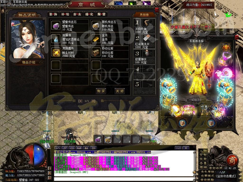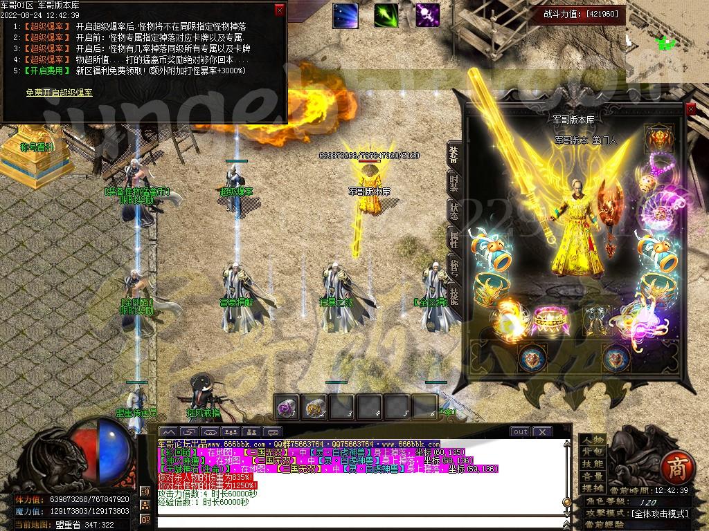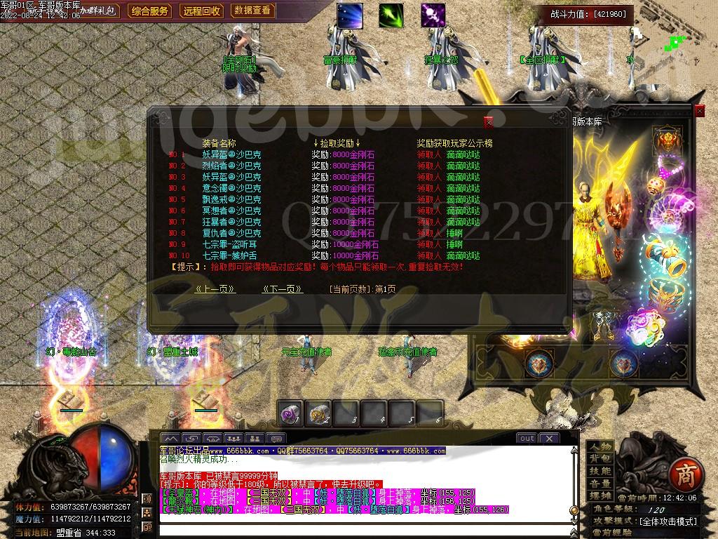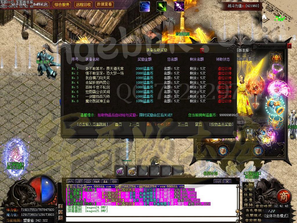 7.快速爆率:礼包-赞助-满勋章(建议老板快速弄到神王〉-狂暴(必开-不开不爆终极〉-捐献﹒满称号-(后期自行体验!麻痹无效复活无效都加爆军最高司达到百倍爆率)