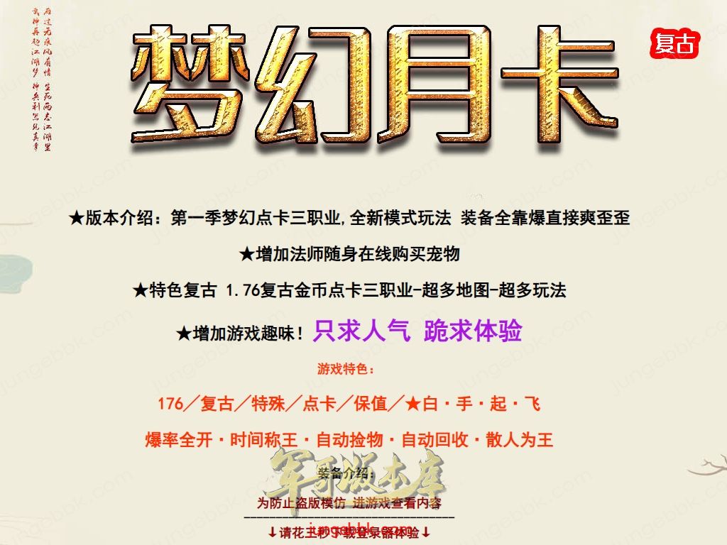修护拾取鉴定+3 纯复古金币服 内容玩法丰富 五行 天赋 生肖 修炼 装备成长等等具体自行探索吧。